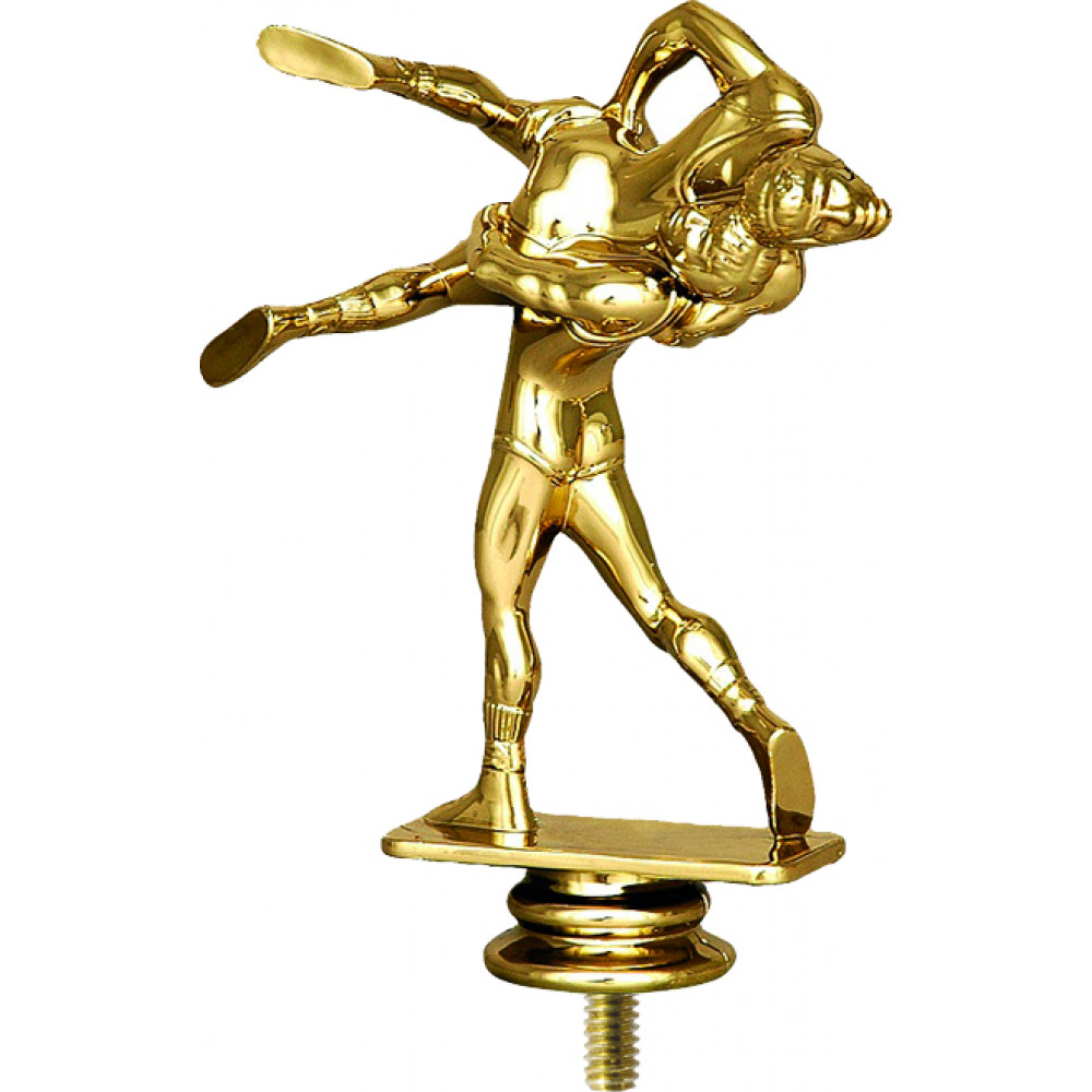 Фигурка пластиковая "Борьба". Цвет золото. Высота 14 см. Изображены два спортсмена борца. Одеты в обтягивающие комбинезоны с короткими шортами. На ногах носки и кеды. Один борец стоит на полу, корпус тела сильно откинут назад, правая нога выставлена назад. Держит второго борца на весу горизонтально поверхности пола. Головы борцов соприкасаются.¶Фигурка установлена на стеме в виде небольшого элемента конусообразной формы. Фигурку возможно закрепить на цоколь, постамент или кубок.