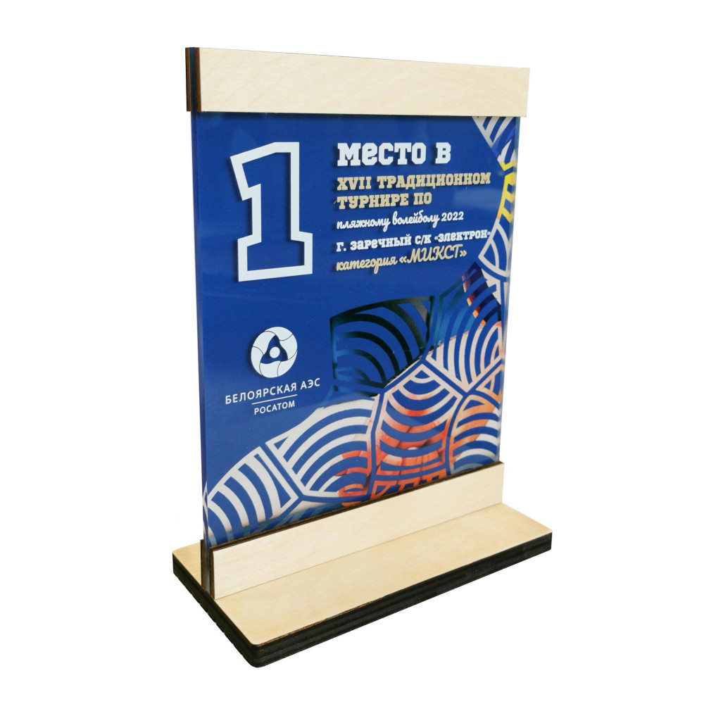 Параметры: Приз из дерева (3-слойный) с акрилом и пластиком, с УФ-печатью