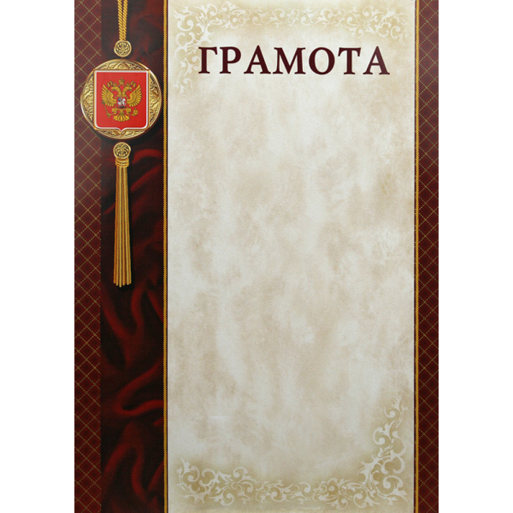 Грамота, формат А4. Бумага матовая, толщина 200 гр, полноцветная печать. ¶Фон грамоты в коричневых тонах. С левой стороны медали сверху вниз проходит линия с изображением бархатной коричнево-бордовой ткани. В верхней части находится узорная медаль с гербом России, от медали вниз свисает длинная декоративная кисточка. справа от нее расположен бежевый неоднородный фон с узором в верхней и нижней части. В верху написано слово "Грамота" темно-коричневым цветом. По левому и правому краю грамоты находятся неширокие полосы коричневого цвета в клетку.