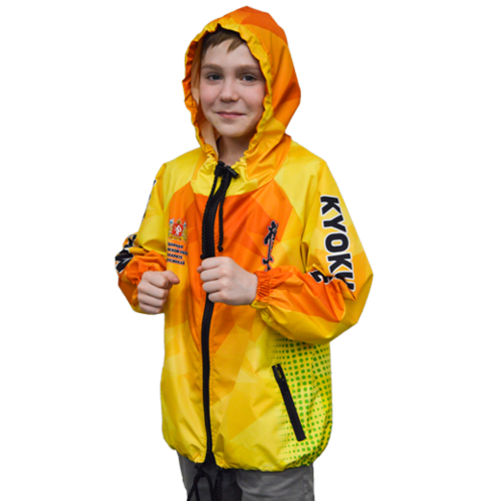 Параметры: Костюм детский (ветровка с капюшоном и брюки, без подклада), материал: дюспо с полной запечаткой