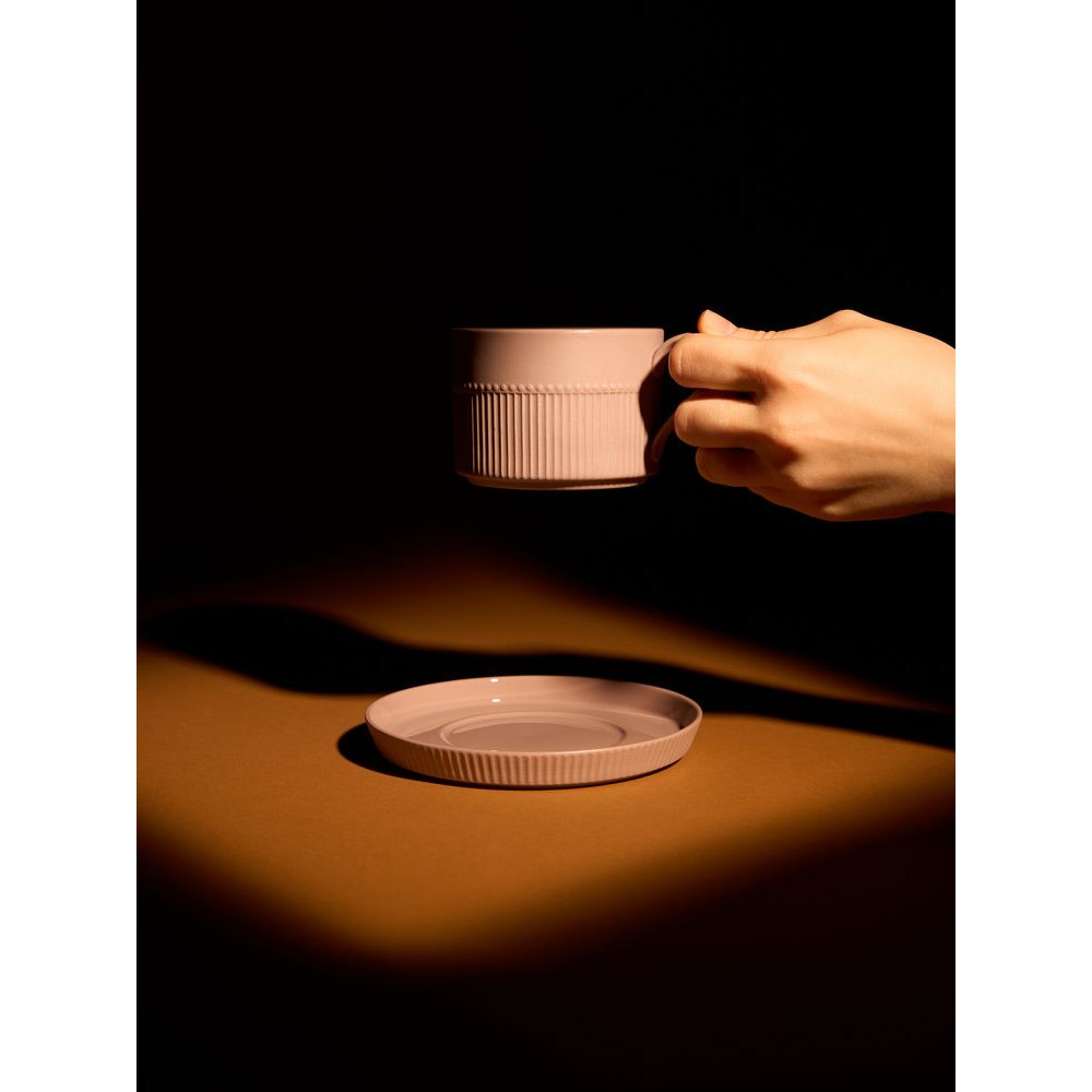 Орнамент корпуса кружки и высокого бортика блюдца напоминает изящные каннелюры — вертикальные желобки на колонне. Это добавляет всему изделию изысканности и стилистической завершенности, благородства и античной строгости.