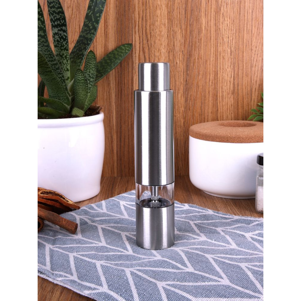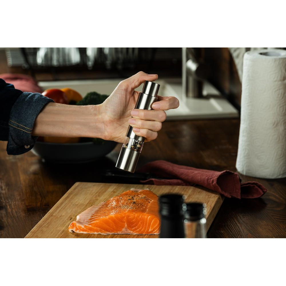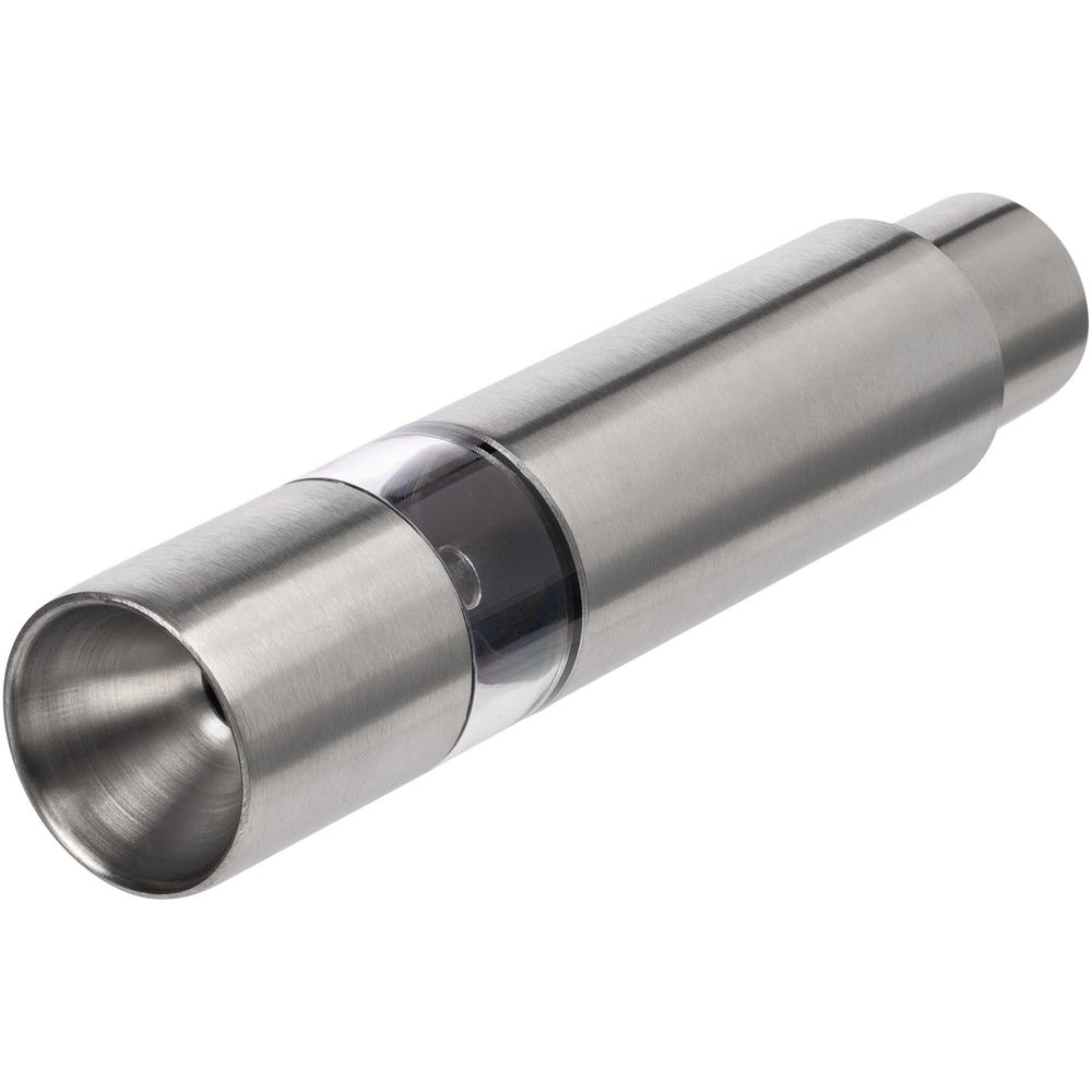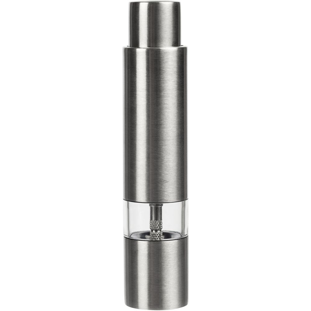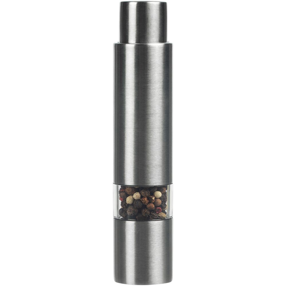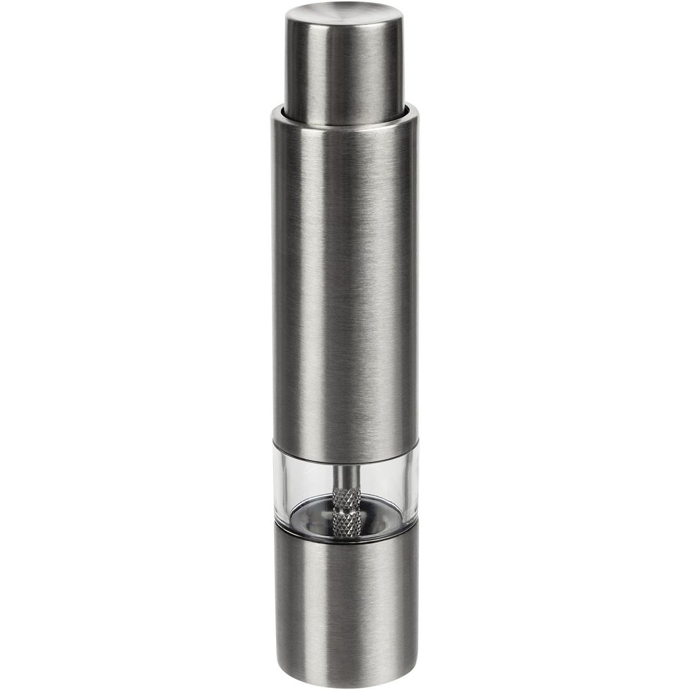 Компактная ручная мельница с пружинным механизмом и металлическими жерновами.